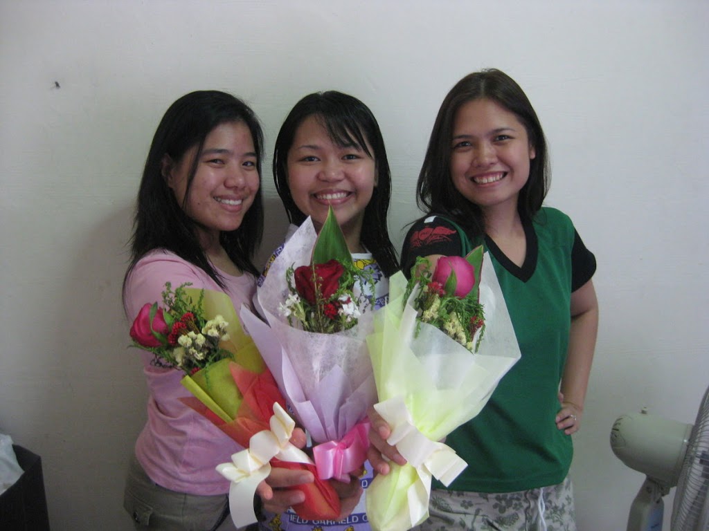 I organized a valentines exchange gift and potluck held at Chi’s and AA’s flat. Our lavish feast included the ultimate food for valentines – chocolate fondue and wine. I loved my gift from Chi which includes a massager (a yellow hand on a stick), a ticket to The Arena club, and a cute teddy bear which I have named Tridee or 3D after her (Trish) and me. We watched movies and chatted a lot. Cate and I ended up staying the night and talking about everyone. The next day, the four of us had lunch together and chatted till 3pm. Mga chismosa!! A pleasant surprise awaited Cate and me at home – flowers from our “parents.” This has been a most wonderful valentines day indeed and I super don’t regret turning down that guy for this!