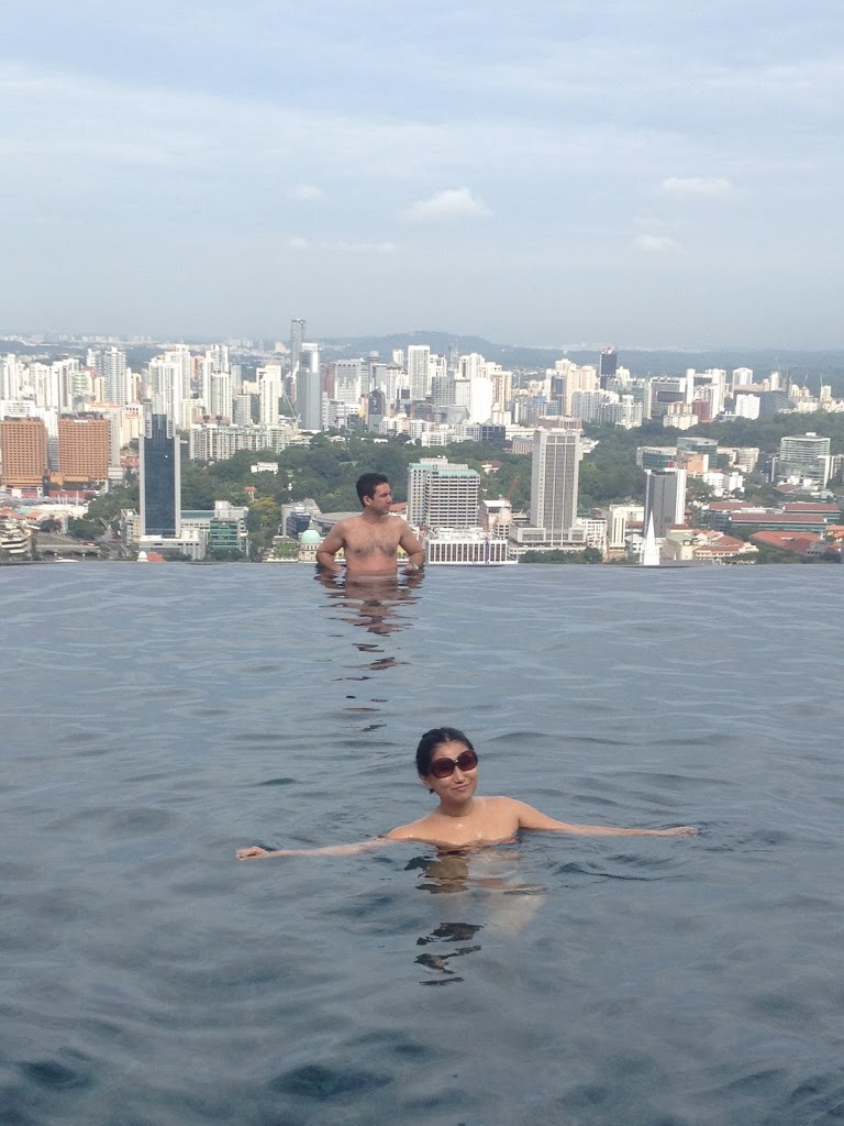 Tummies full, we went back up to our room and changed into our swimsuits, donned our terry cloth bathrobes, and took two sets of lifts to get to 56th floor and found ourselves at the famous infinity pool.