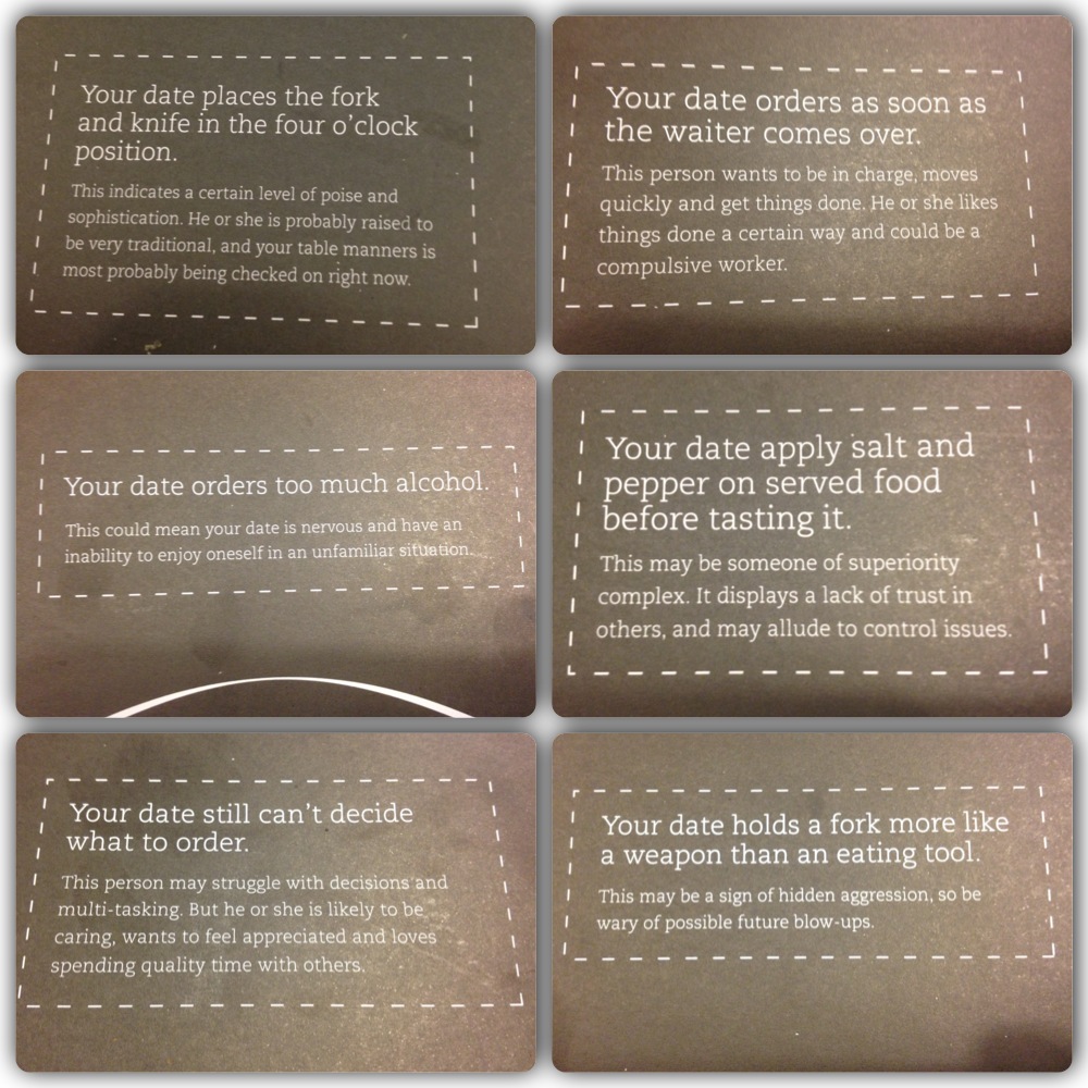 Also their place mats had cute trivia written on it, saying: “Know your date through Table Manners” and has these tidbits scattered around it. I took a picture of each description and put them all together using my Instacollage app – a must download app, btw! Go get it now, it’s free!