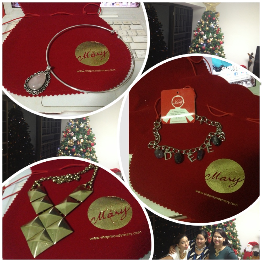 And now for a little background. Moody Mary sells handmade accessories and was first introduced to me by my friend Nikki who is friends with the owner Jil. When she mentioned that Jil customizes jewelry, I got excited because I have always wanted to have a name necklace and maybe she could make me one. So one fine day last December saw me trooping over to Moody Mary’s with my friends Nikki and Mildred. My idea was to make a necklace that looked like a bracelet, with gemstone charms and my initials dangling from it. Jil very gamely took up my idea and made the necklace on the spot, while we browsed through her store: