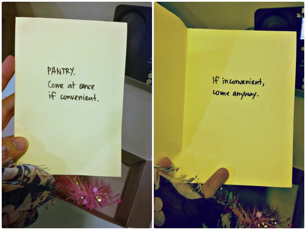 Me: Ooooooor! She gets a call at 5pm from someone saying that she has a package outside the gantry. She goes and finds a package for her. When she opens it, there is a note inside, saying, “meet us at the pantry.”