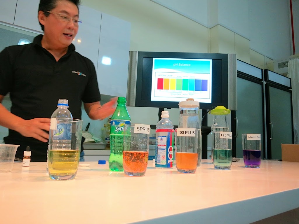 David then gave us a visual of just how acidic certain liquids are. He showed us a color scale from red being the most acidic to purple being the most alkaline. Then he poured different liquids into glasses marked with what brand liquid they were, then used a dropper to drop some liquid and we watched in stunned fascination as the liquids switched colours before our very eyes. It was no surprise that sprite was acidic, but can you believe that 100 Plus is also very much so? We also found out that Singapore’s tap water is more alkaline than Life mineral water. Naturally, alkaline water was a perfect shade of purple. Wow. How eye-opening. I suddenly realize how important it is to choose my drinks wisely. We really do need an ionizer in our household!