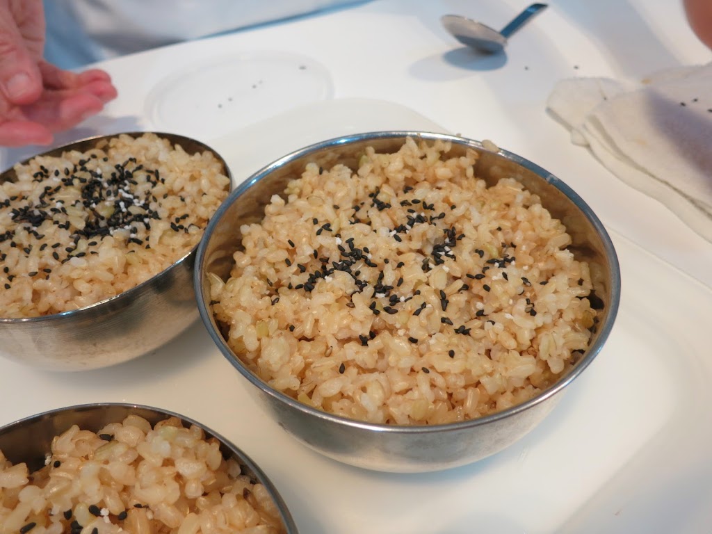 She then proceeded to demonstrate how it was easy to cook some delicious but healthy dishes using alkaline water, and then we got to sample them all as they were ladled out on little plastic plates and passed around. Yummy! I especially liked the pear salad and brown rice with sesame seeds!