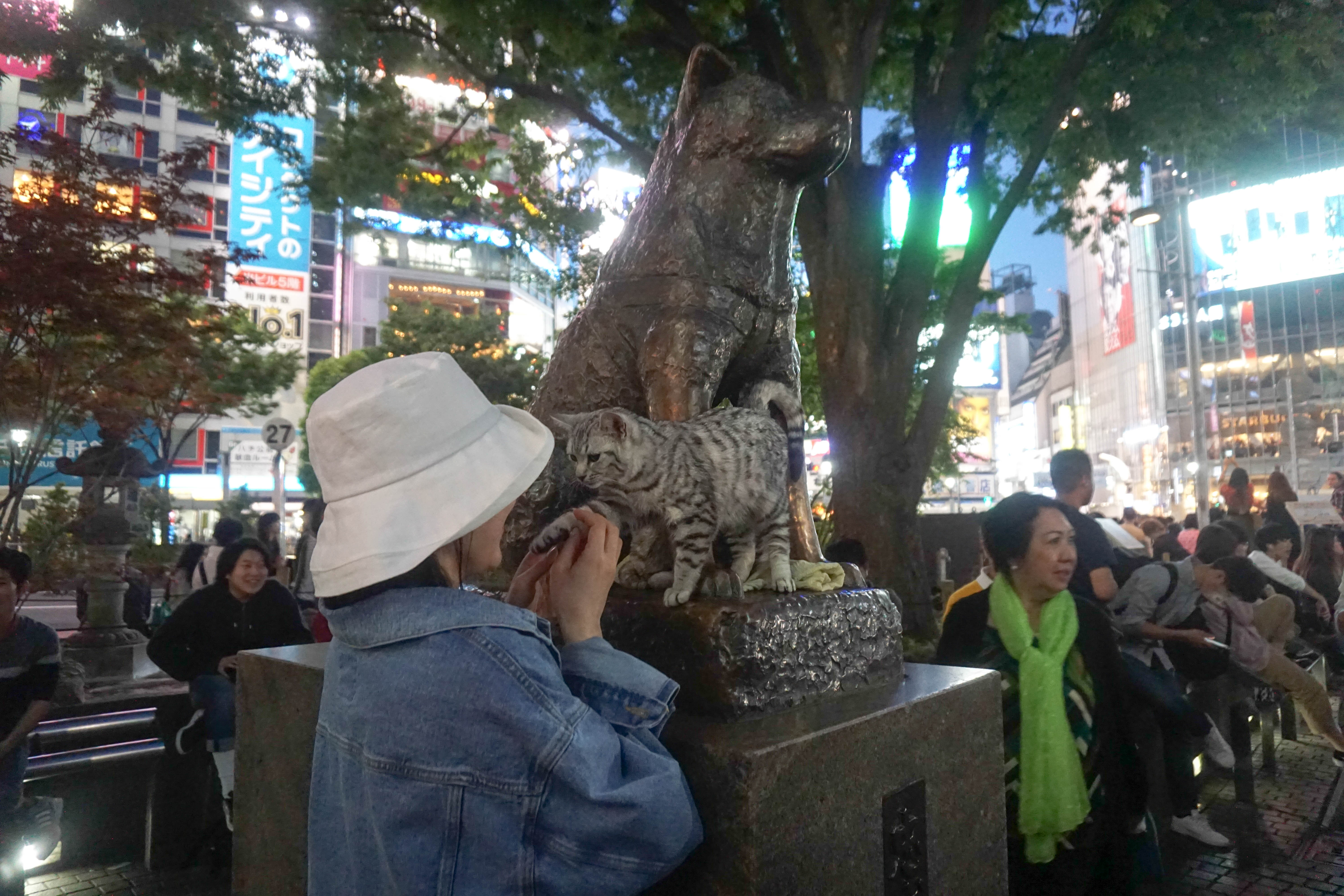 On our first day, we visited the famous Shibuya Crossing. We first dropped by the famous Hachiko statue, and I was so surprised when someone plonked two adorable cats on the statue.