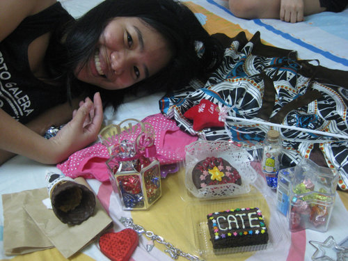 Before that, at the stroke of midnight, we flatmates gave Cate our star-themed presents for her – star charm on a bracelet, star-shaped earrings, Mrs. Fields cookie and P.osh brownie with customized star design, panty with little stars, star-shaped chocolates in a star-shaped case (thanks to AA), chocolates in star-designed wrappers, and a star wand. We also got her a pint of her most favorite Andersen’s Belgian chocolate chip ice cream with a choco-dipped sugar cone, a dress, and messages from her loved ones rolled up inside capsules and placed in a small bottle. The reason for the star theme is that Cate loves making paper stars.