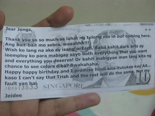 For Rodel, our gift was a wallet, and I printed the messages I collected for him like Singaporean money bills that he could tuck into our gift should he want to.