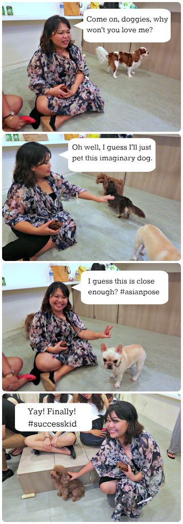 Great idea, eh? This idea apparently sprung from Japan, where someone realised that there was a need for stressed businessmen to relax by bonding with felines and came up with cat cafes. When that became popular, someone in Korea then thought hey, why not dogs, too? Somehow, that idea made its way to Singapore, much to our delight! 😄